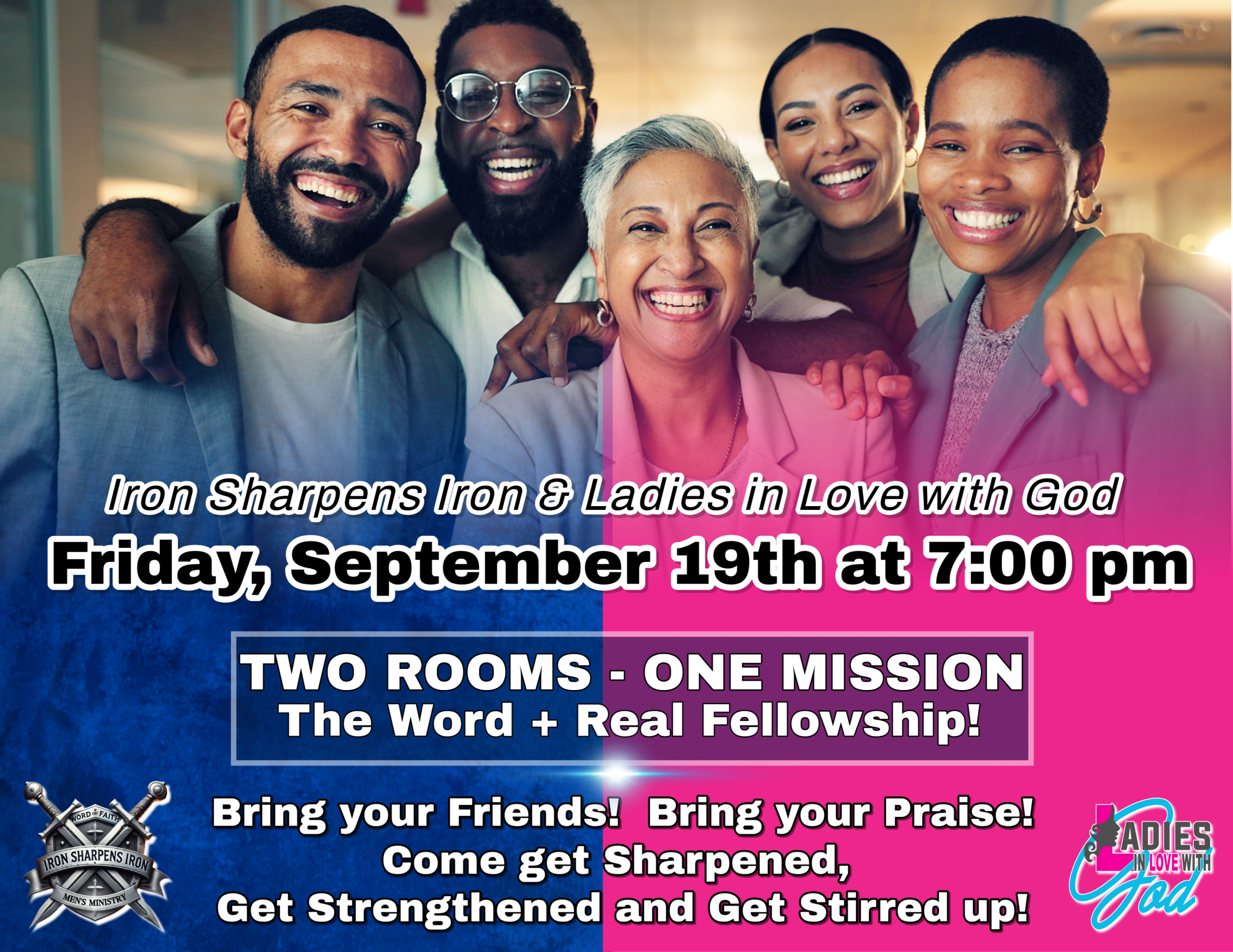 Word of Faith Family, Listen Up! It’s goin’ down Friday, September 19, 2025, at 7:00 p.m.! Iron Sharpens Iron for the men and Ladies in Love with God for the women — two different rooms, but one mission: the Word and real fellowship!